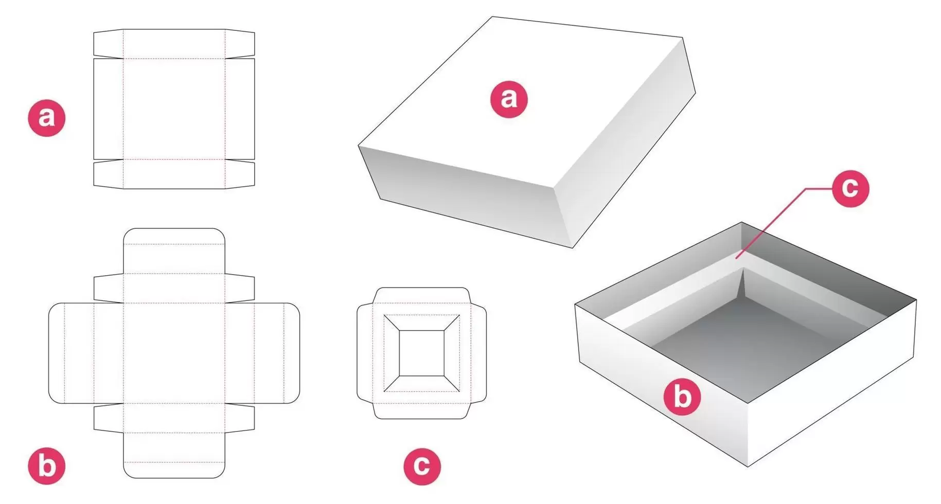 المبدأ الأساسي لصندوق الهدايا القابل للطي هو أن يكون مسطحًا عند فتحه وثلاثي الأبعاد عند طيه. يجب أن يتضمن تصميم القالب جسم الصندوق وغطائه وحوافه القابلة للطي. يستخدم المثال التالي "صندوق هدايا مربعًا بغطاء وقاعدة " (بأبعاد قابلة للتخصيص):