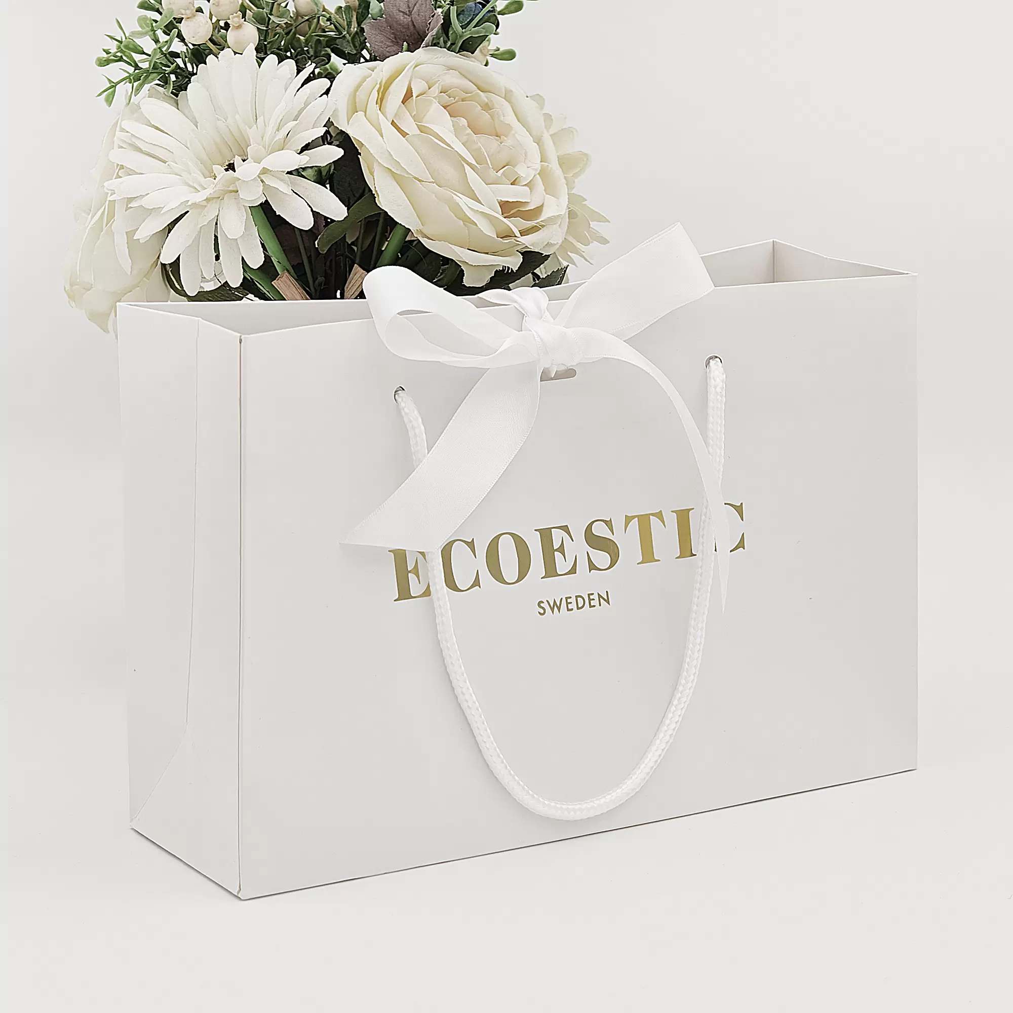 لمن يُقدّرون أرقى ما في الحياة، تُقدّم أكياس الهدايا الورقية الفاخرة بالجملة طريقةً أنيقةً وراقيةً لتقديم الهدايا. تُصنع هذه الأكياس من مواد عالية الجودة، مثل الورق المقوى السميك، والمخمل، والساتان، وتتميز بلمسات نهائية فاخرة، مثل لمسات من رقائق الذهب أو الفضة، ومقابض من الشرائط، وتصاميم مُتقنة. تُعدّ أكياس الهدايا الورقية الفاخرة بالجملة مثاليةً لمتاجر التجزئة الراقية، وهدايا الشركات، والمناسبات الخاصة التي لا تُفوّت إلا الأفضل. بفضل مظهرها الرائع وملمسها الفاخر، ستترك هذه الأكياس انطباعًا لا يُنسى لدى أي مُتلقي.